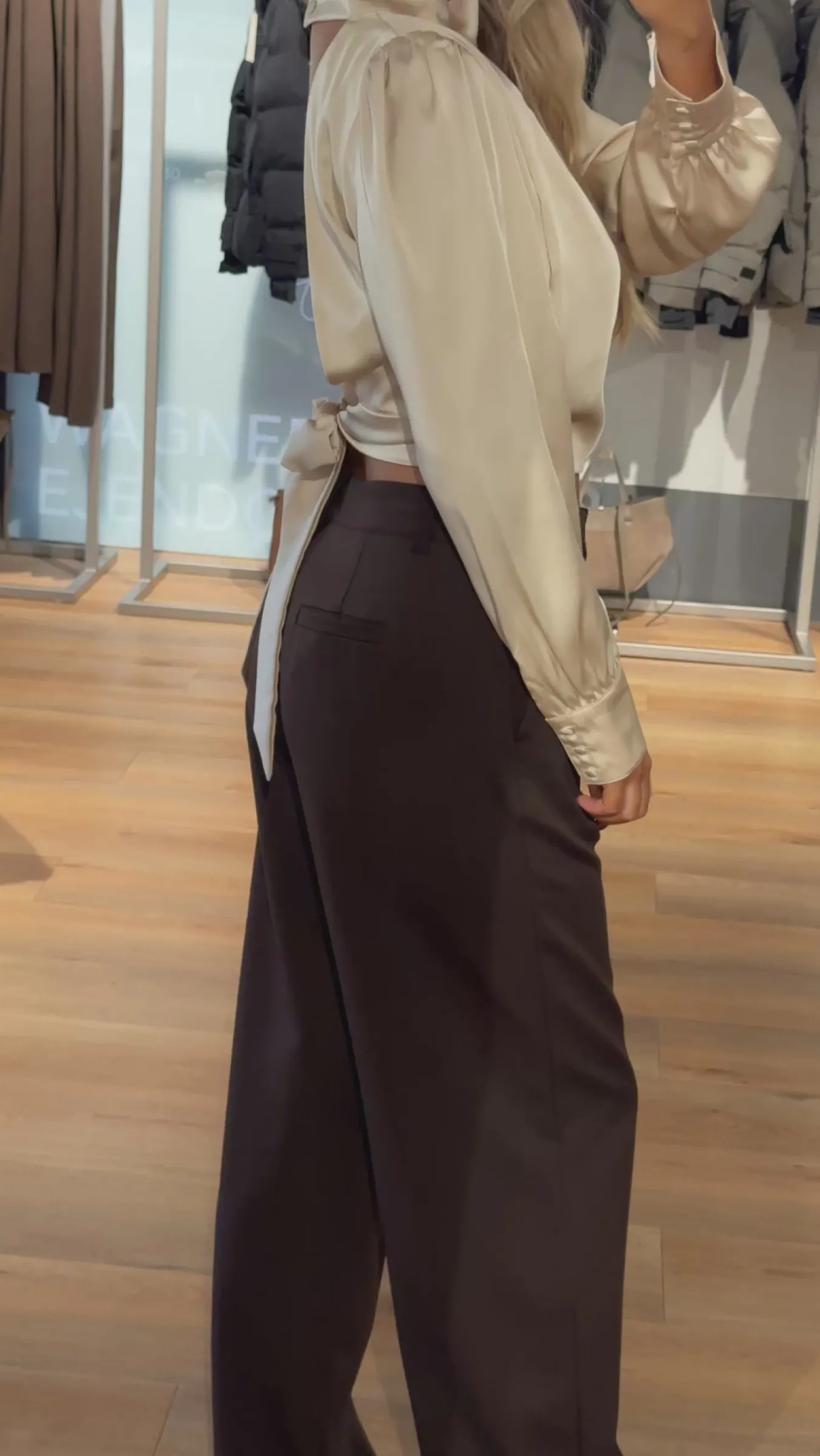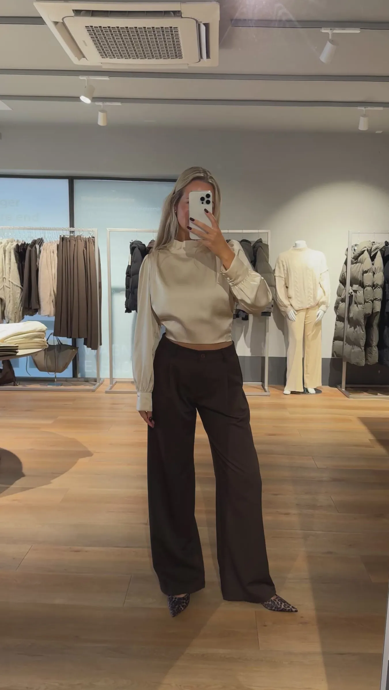 Ana blusen har en åben ryg og lukkes i nakken. Den har knapper på ærmerne som har en ballon form og går ind omkring håndleddet.