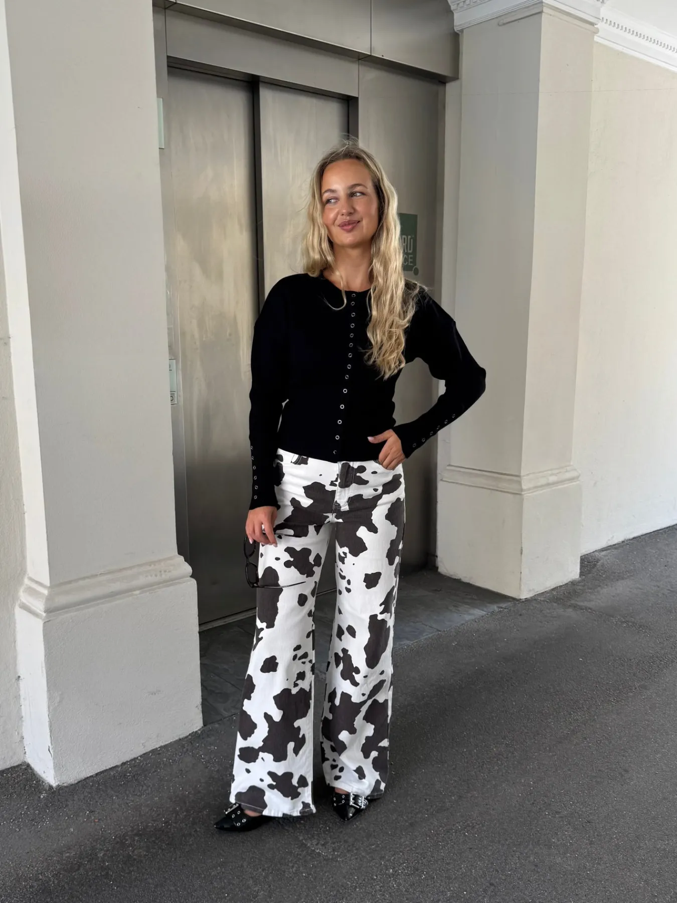 Valerie bukserne har det fineste ko-print. Bukserne har en bred pasform og en masse elastik.
