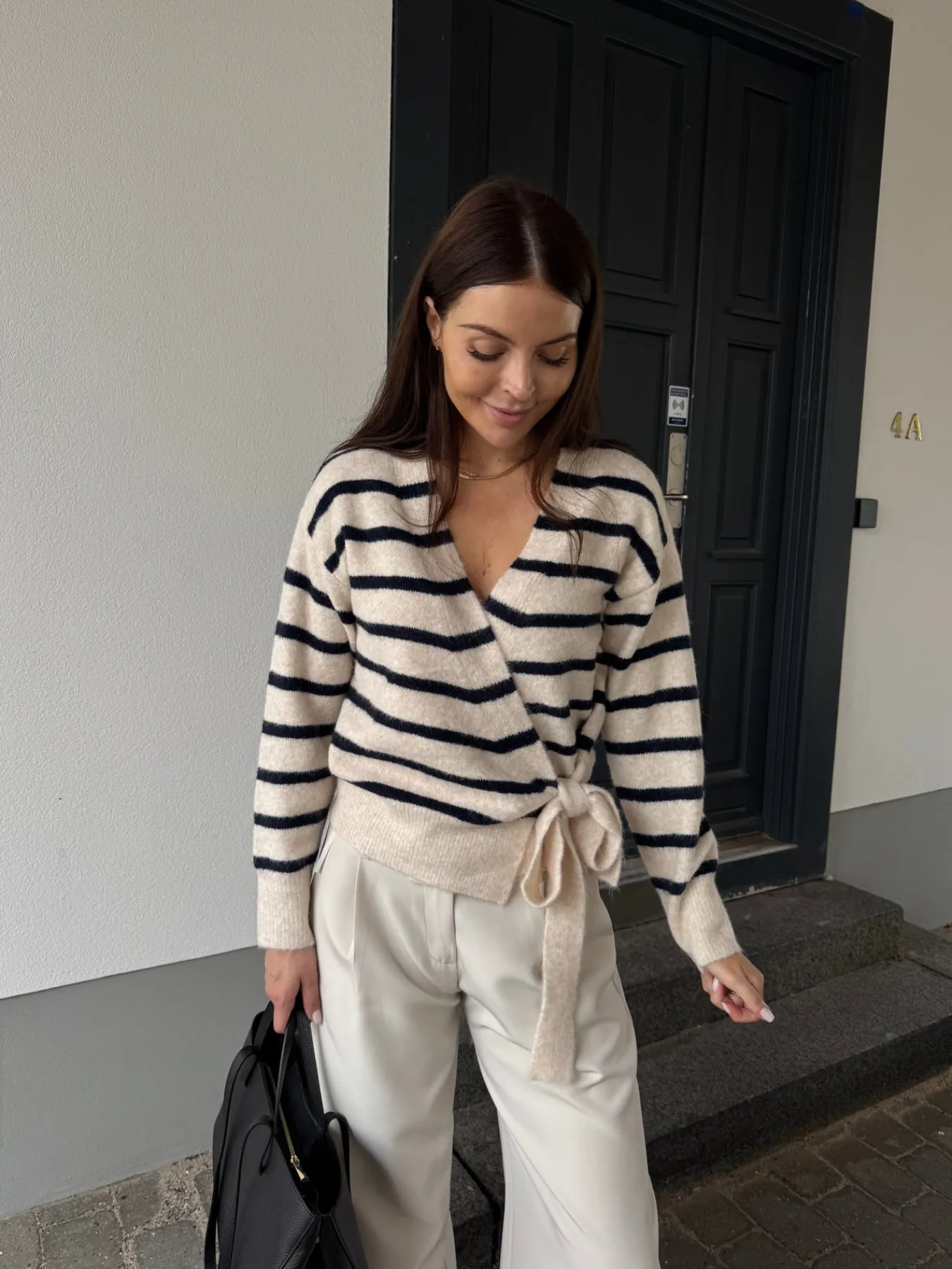 Esther strikken bindes i siden og har en løs pasform. Den har en v-udskæring.