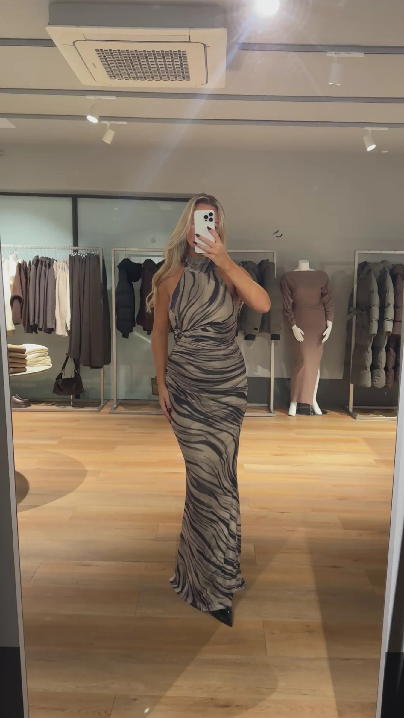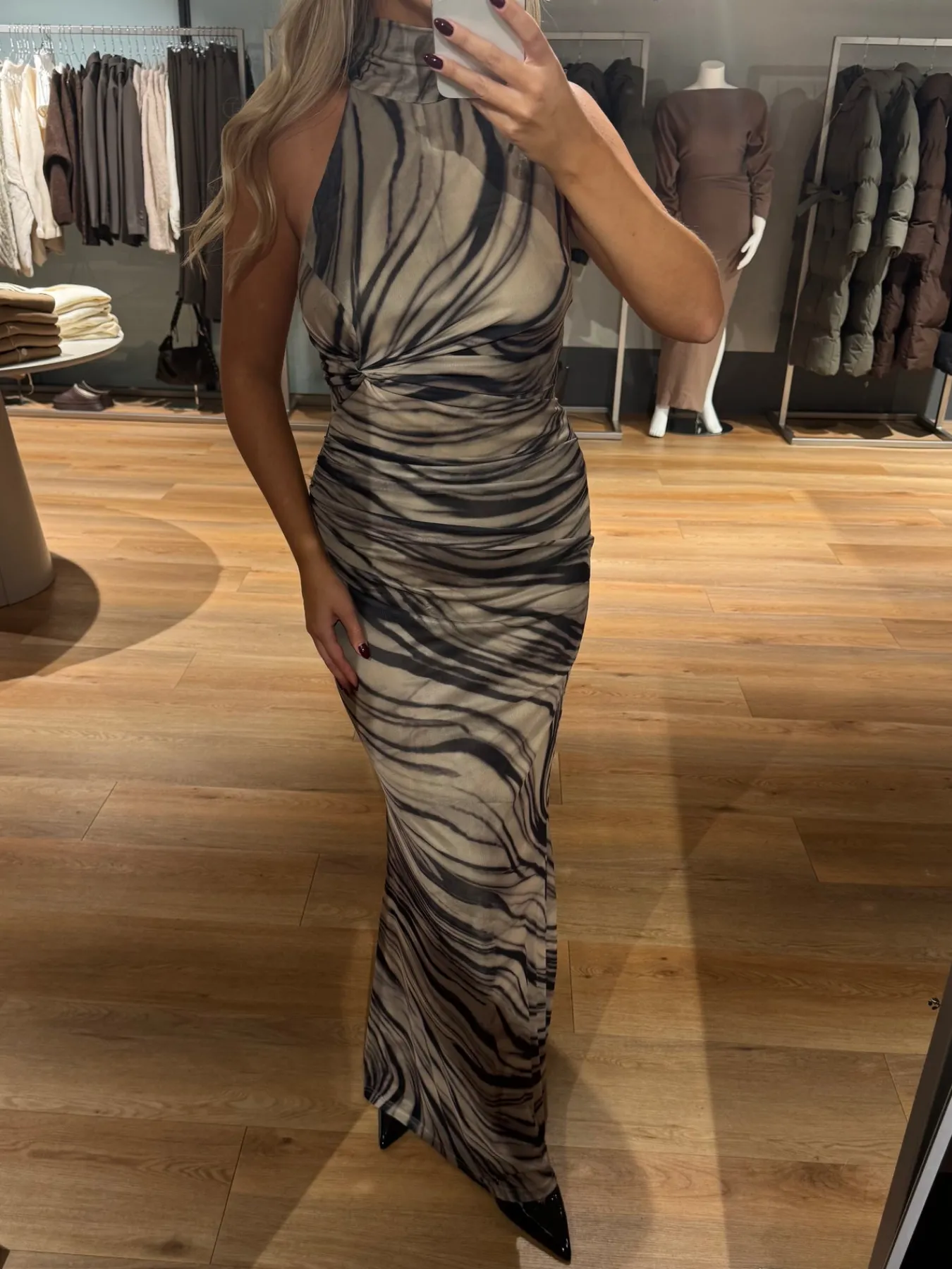 Sara kjolen går på omkring halsen og har en åben ryg, kjolen bliver bundet i nakken. Den har scrunch i siden, som giver kjolen mere form. Kjolen er tætsiddende. Denne smukke kjole er perfekt til årets sidste fester og nytår.