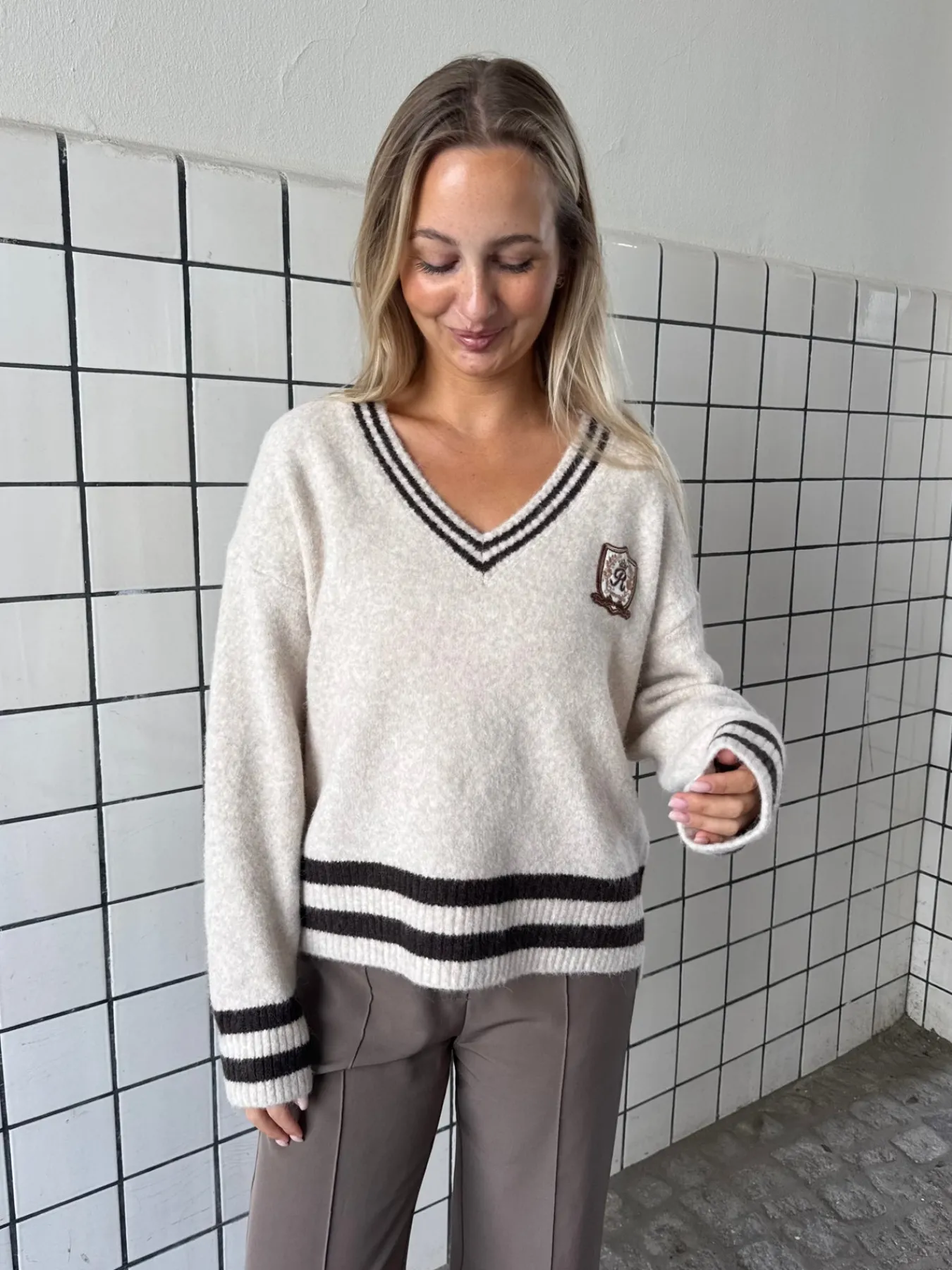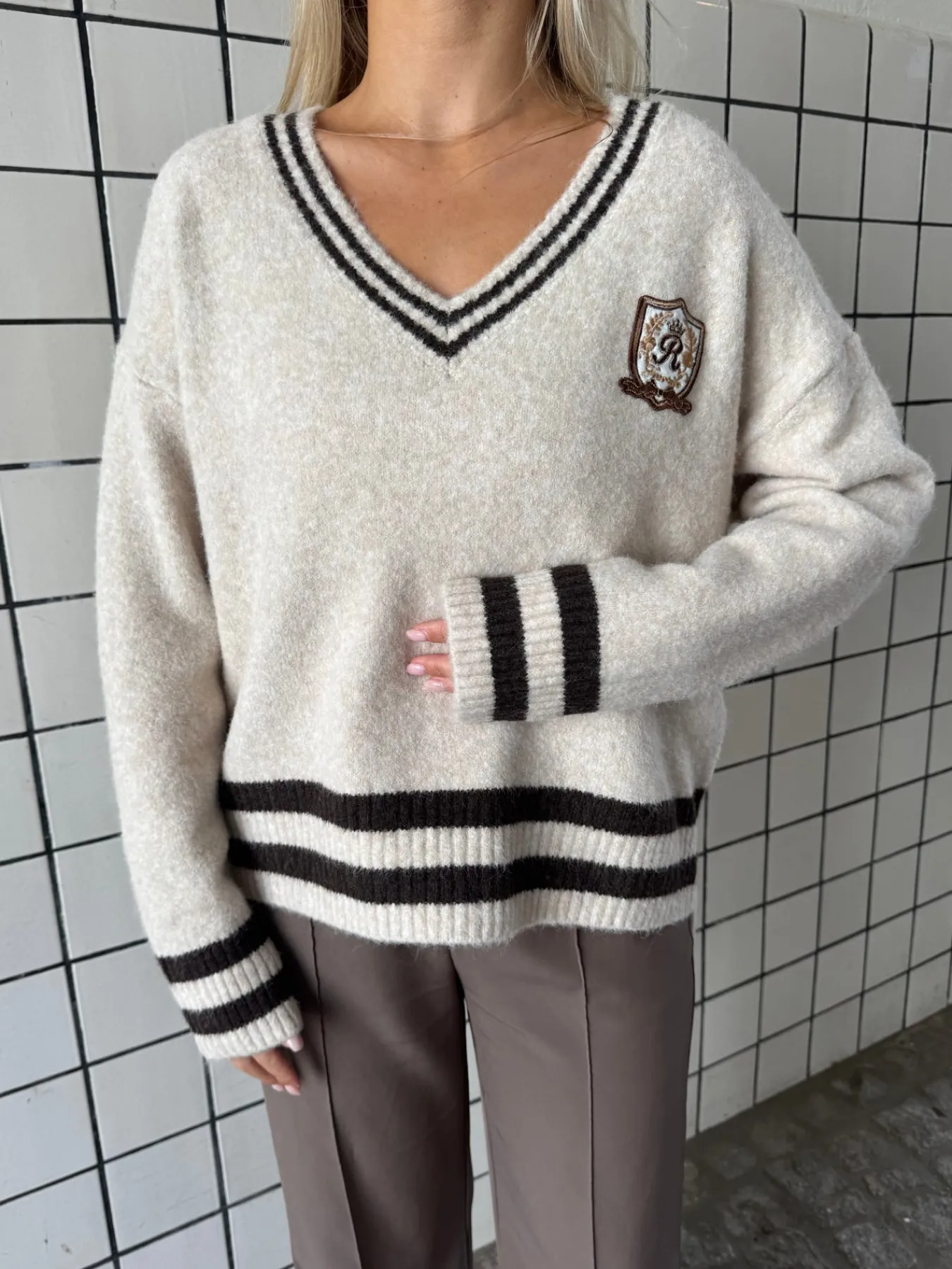 Chloe strikken har en dyb v-udskæring den har en bred bund og brede ærmer.