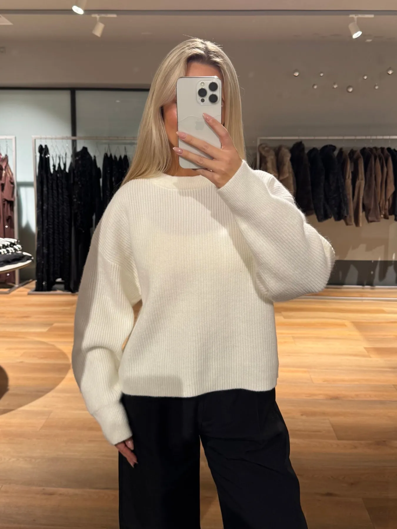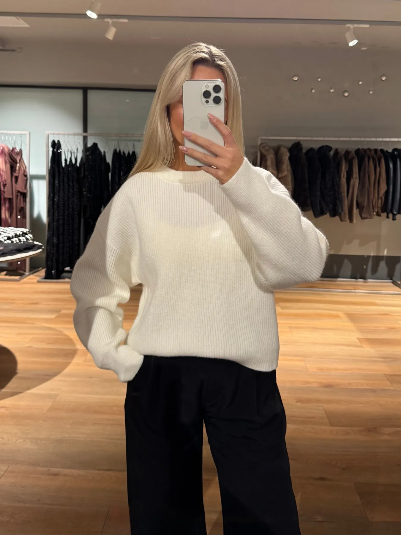 Josefina strikken har en bred halsudskæring. Den har cuffs omkring håndleddet og ellers en løs pasform.
