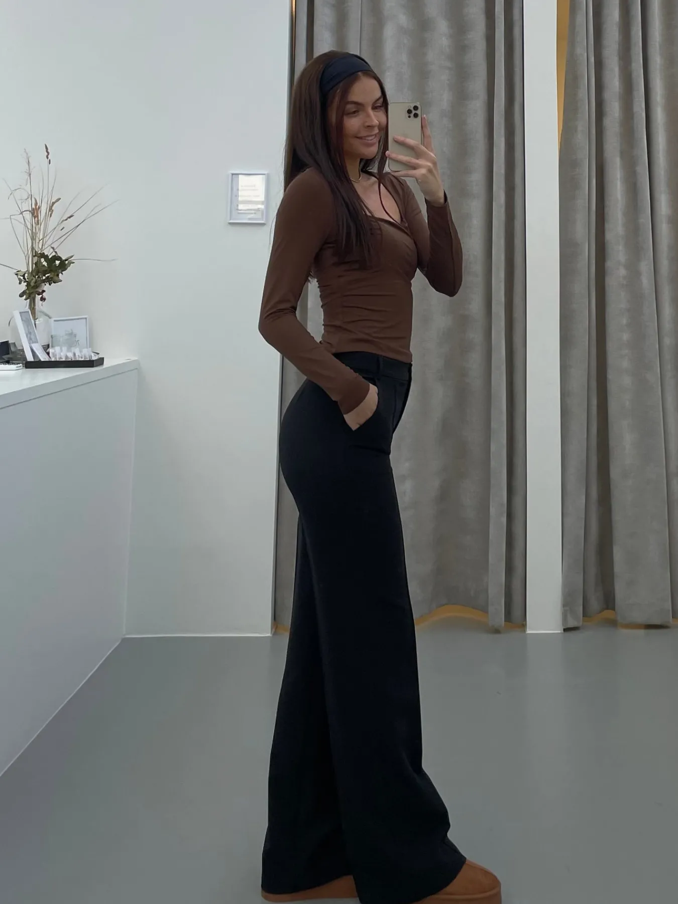 Elegante og strækbare habitbukser. Bukserne har vidde i bunden og spændes med en knap i livet. Styles perfekt med et par sneakers eller stiletter.