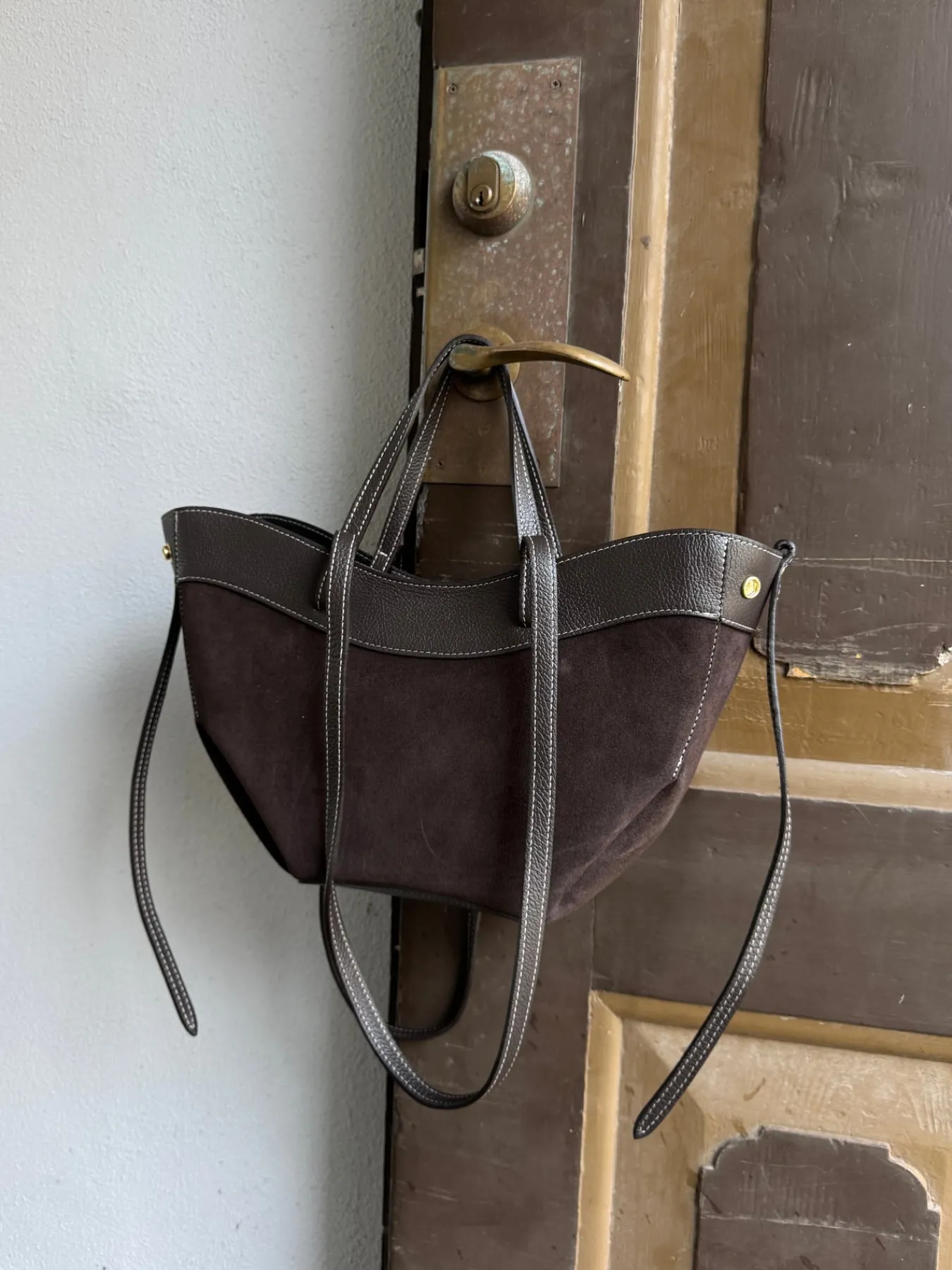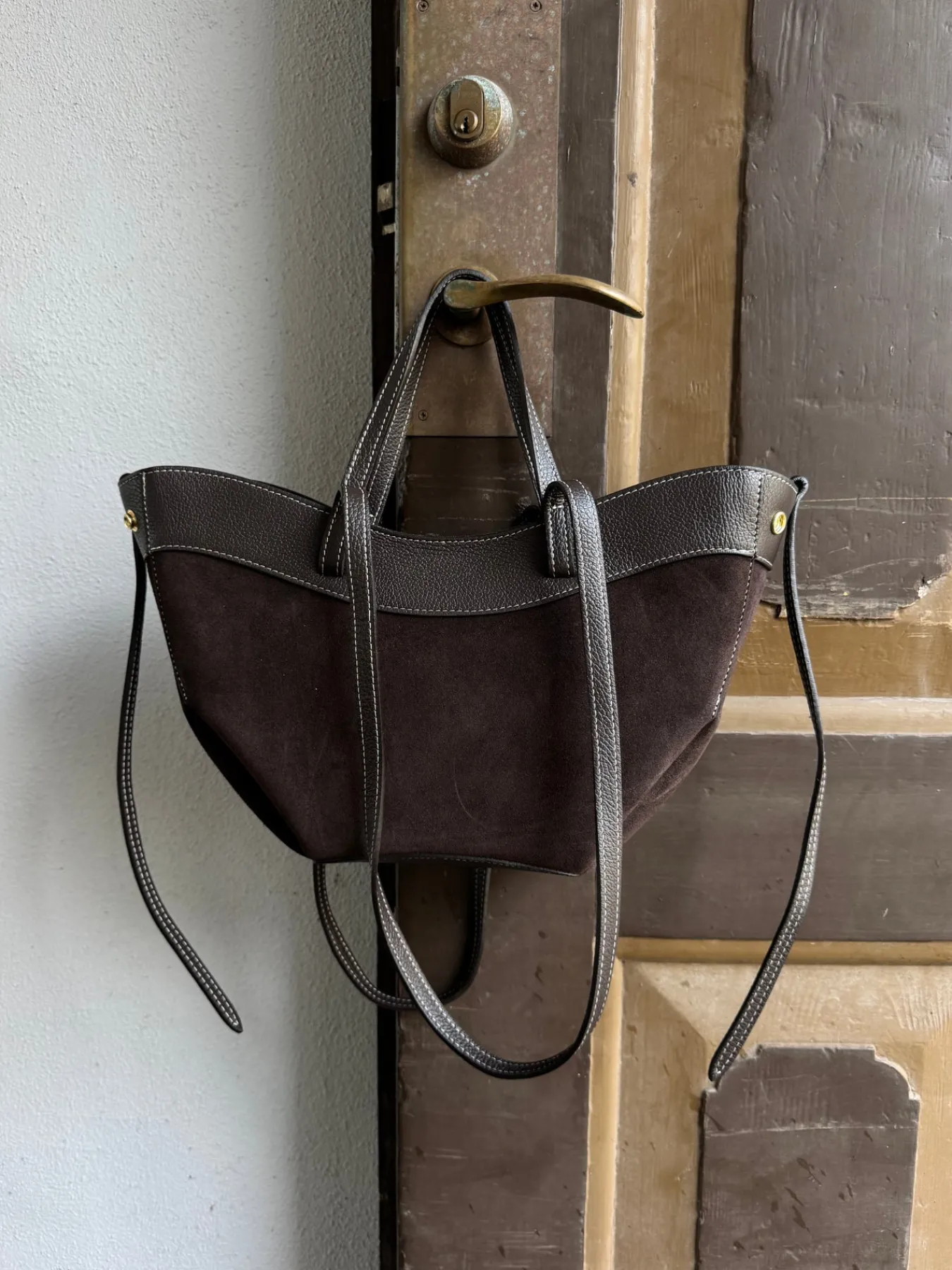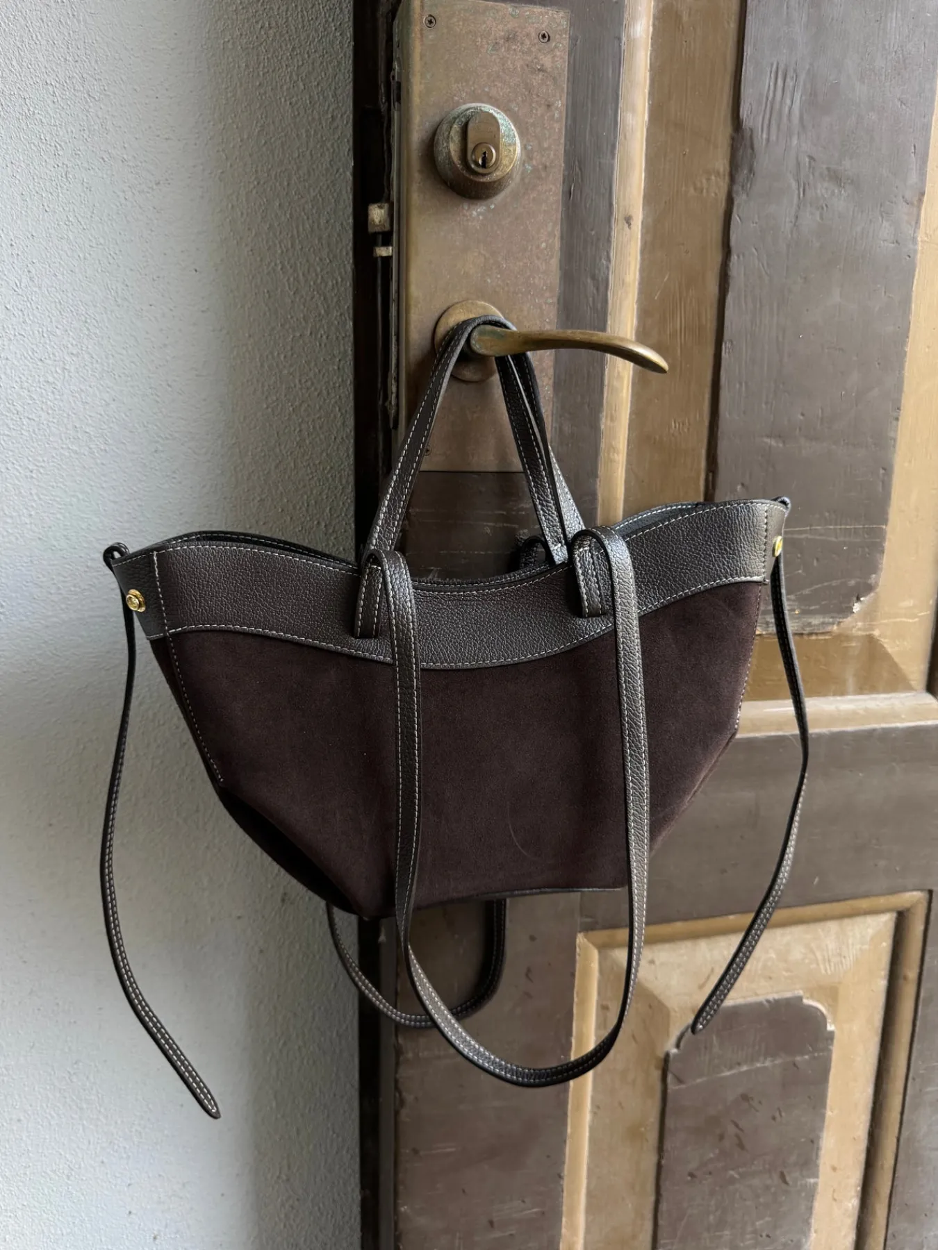 Matilda tasken er i ægte ruskind og har side knapper og en lynlås lukning. Den har indvendige lommer og har håndtag og skulderrem.