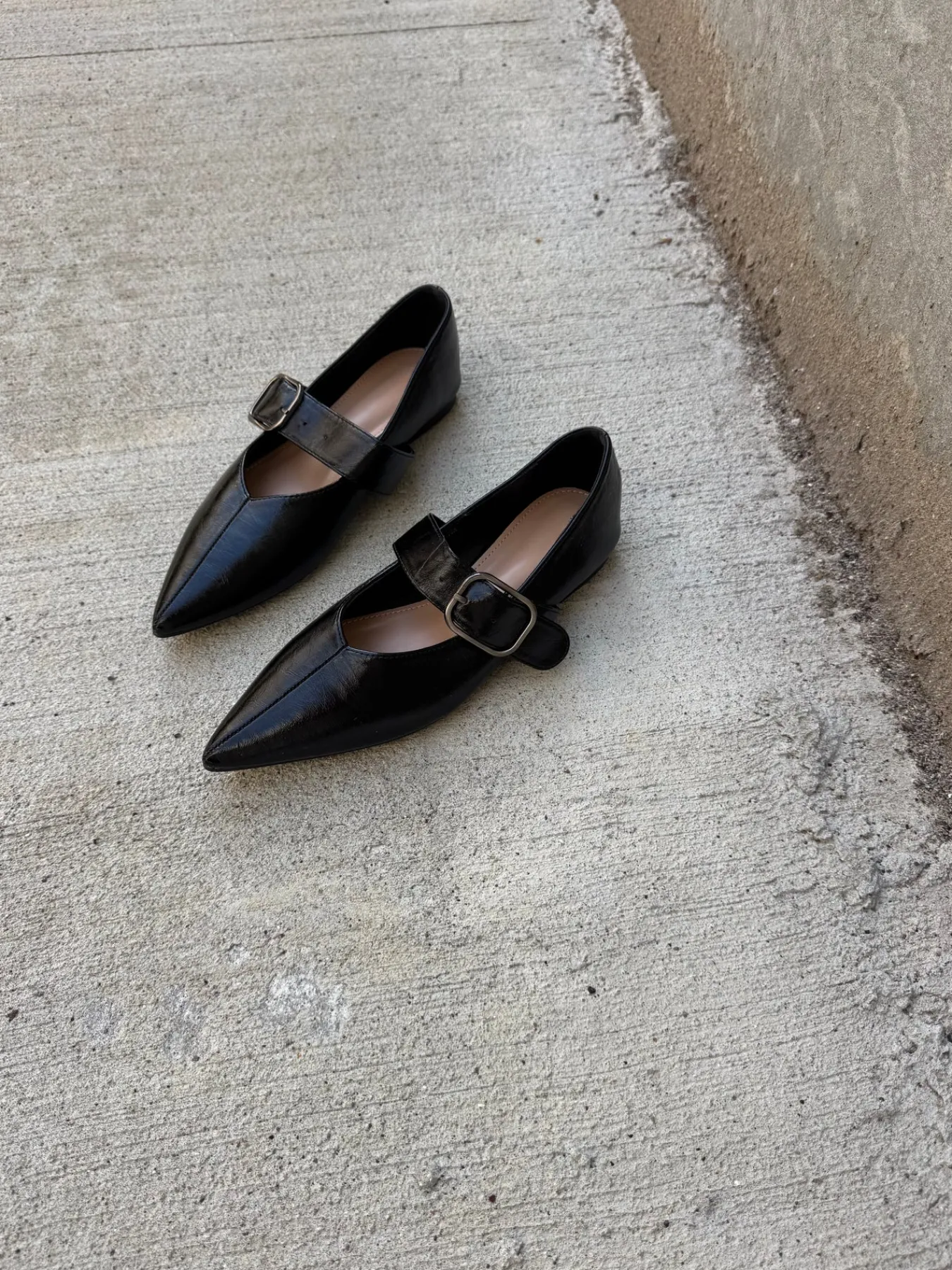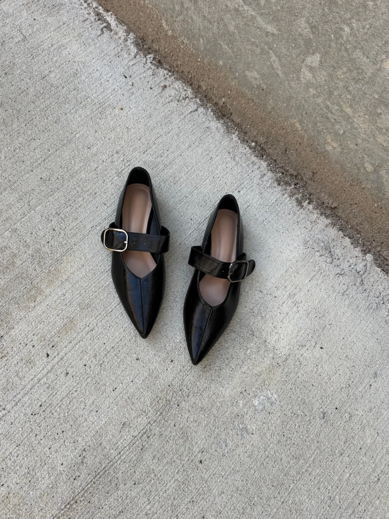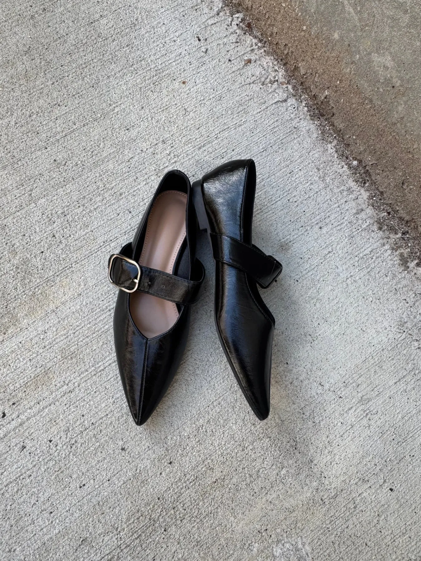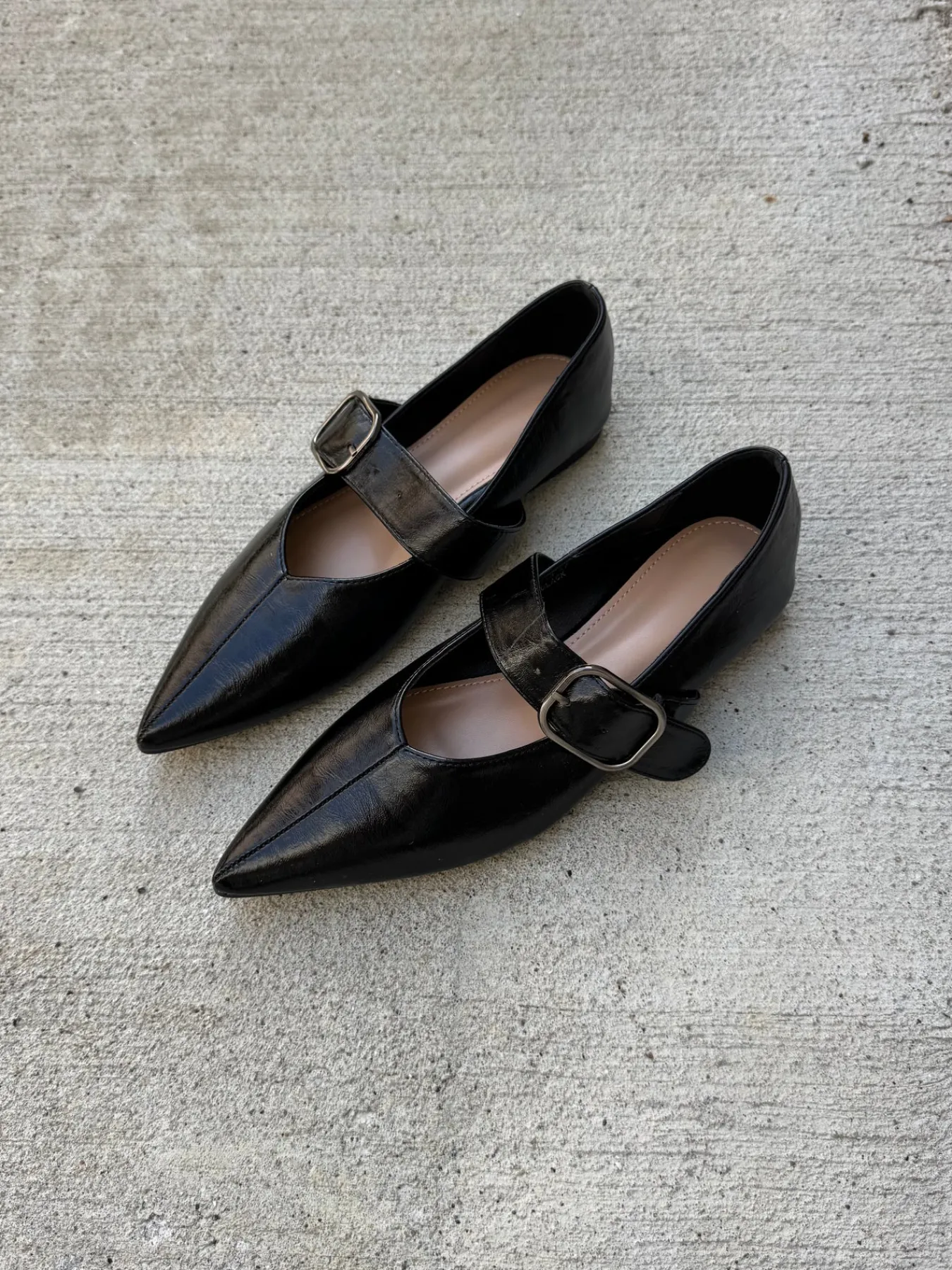 Sofia ballerinaerne har en spids snude. De har en bred rem over foden og en lille hæl. Skoen er perfekt til efteråret og sensommeren og kan bruges både til hverdag og til festlige lejligheder.