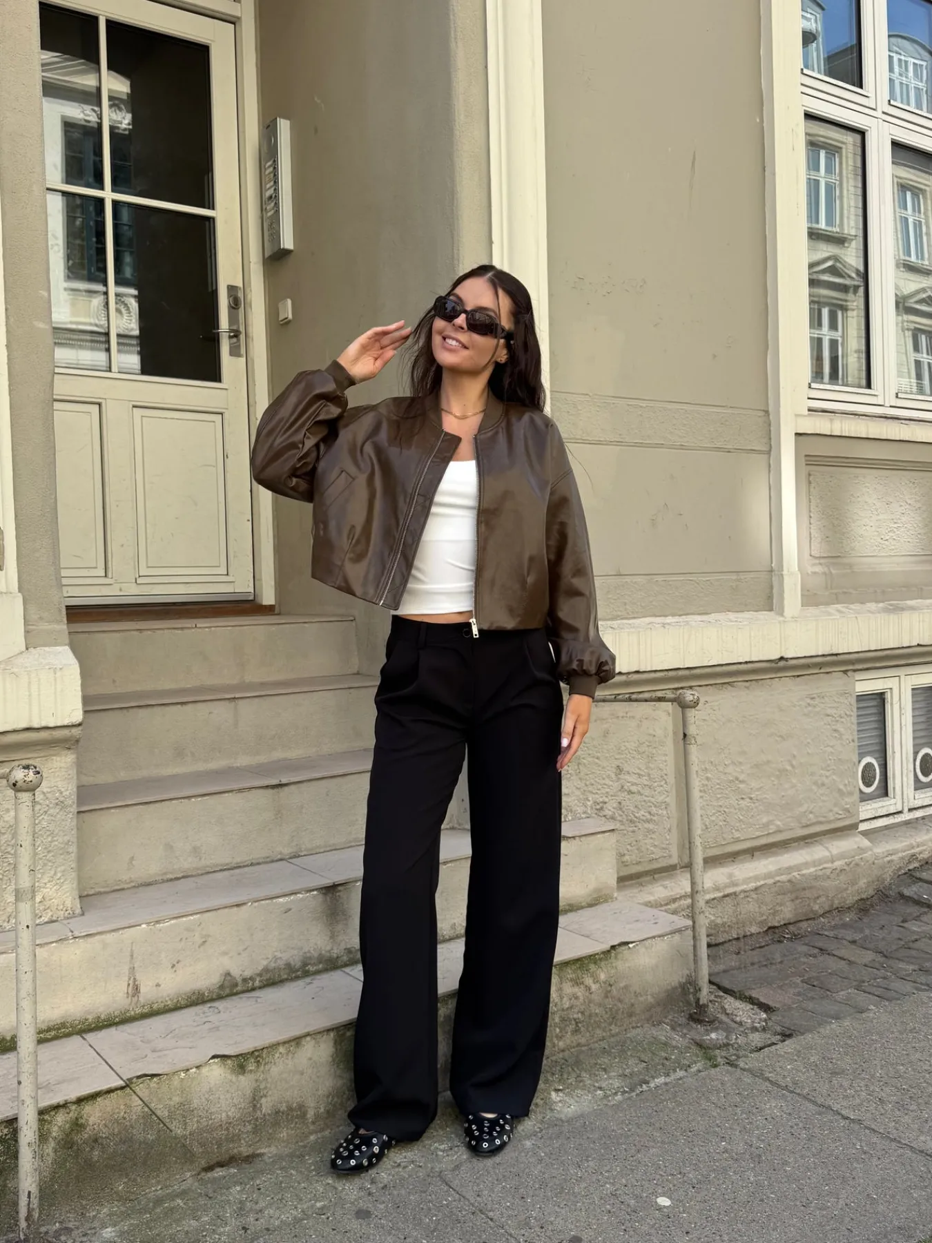 Estella jakken er kort og skær omkring hoften. Den har cuffs omkring håndleddet.