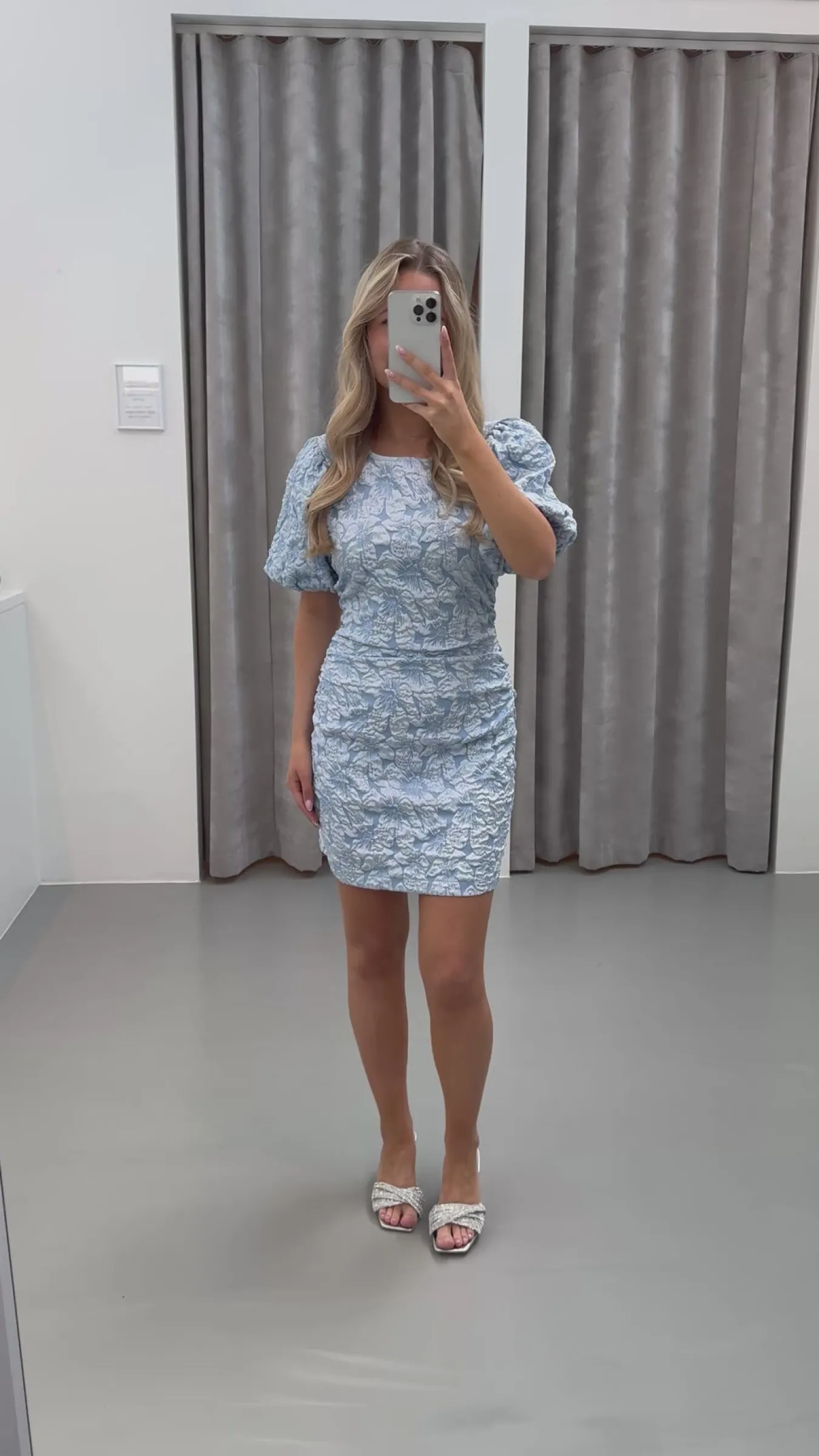 Caroline kjolen har de fineste puff ærmer og har elastik i siderne, som giver den fineste ruffle effekt. Kjolen er tætsiddende og perfekt til sommeren.