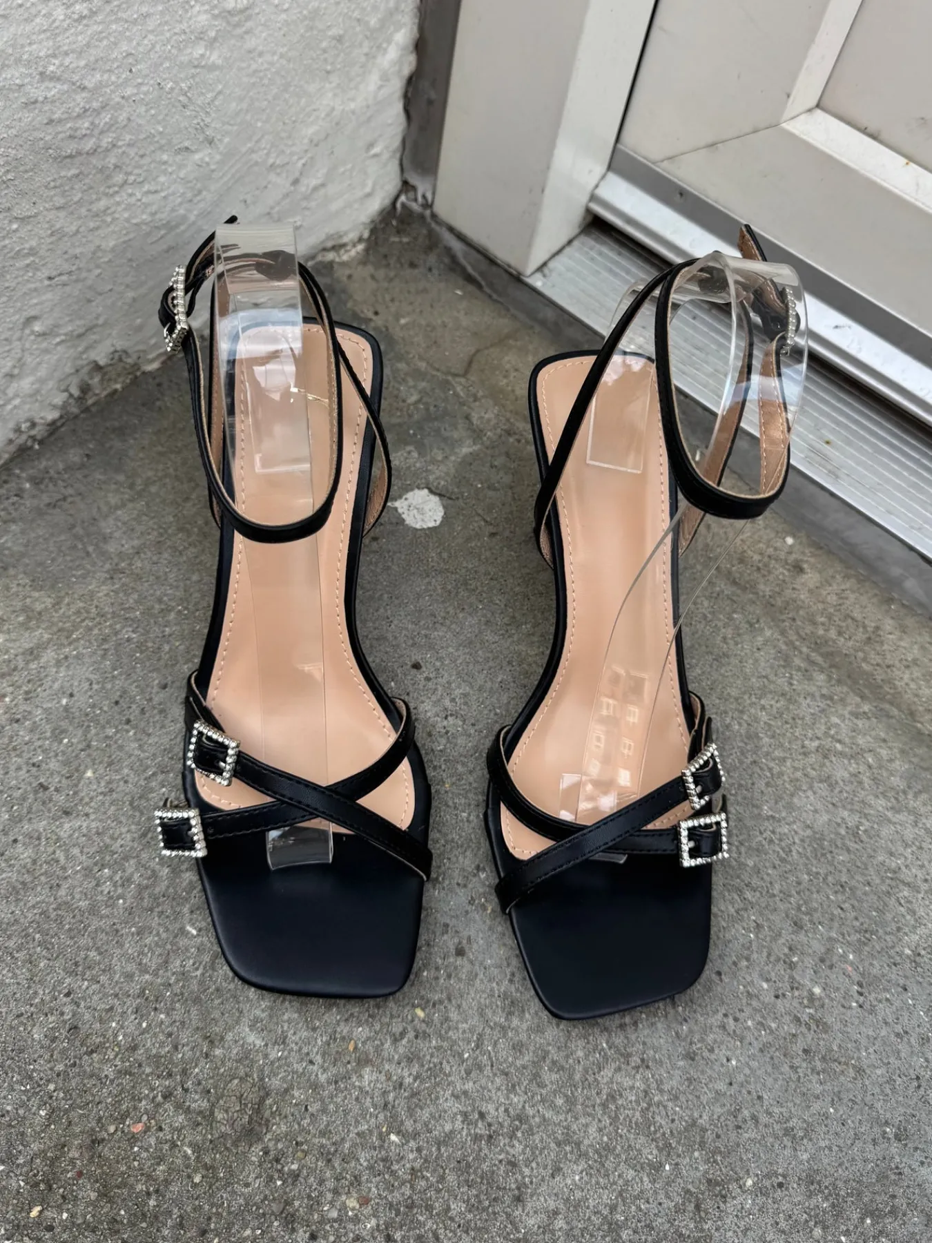 Lucia stiletterne går op omkring ankel of spændes der. De har en glimmer spænde omkring anklen, men også foran omkring fødderne.