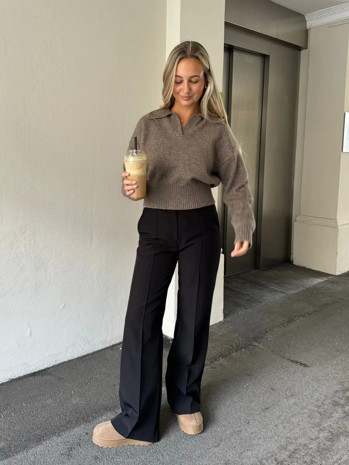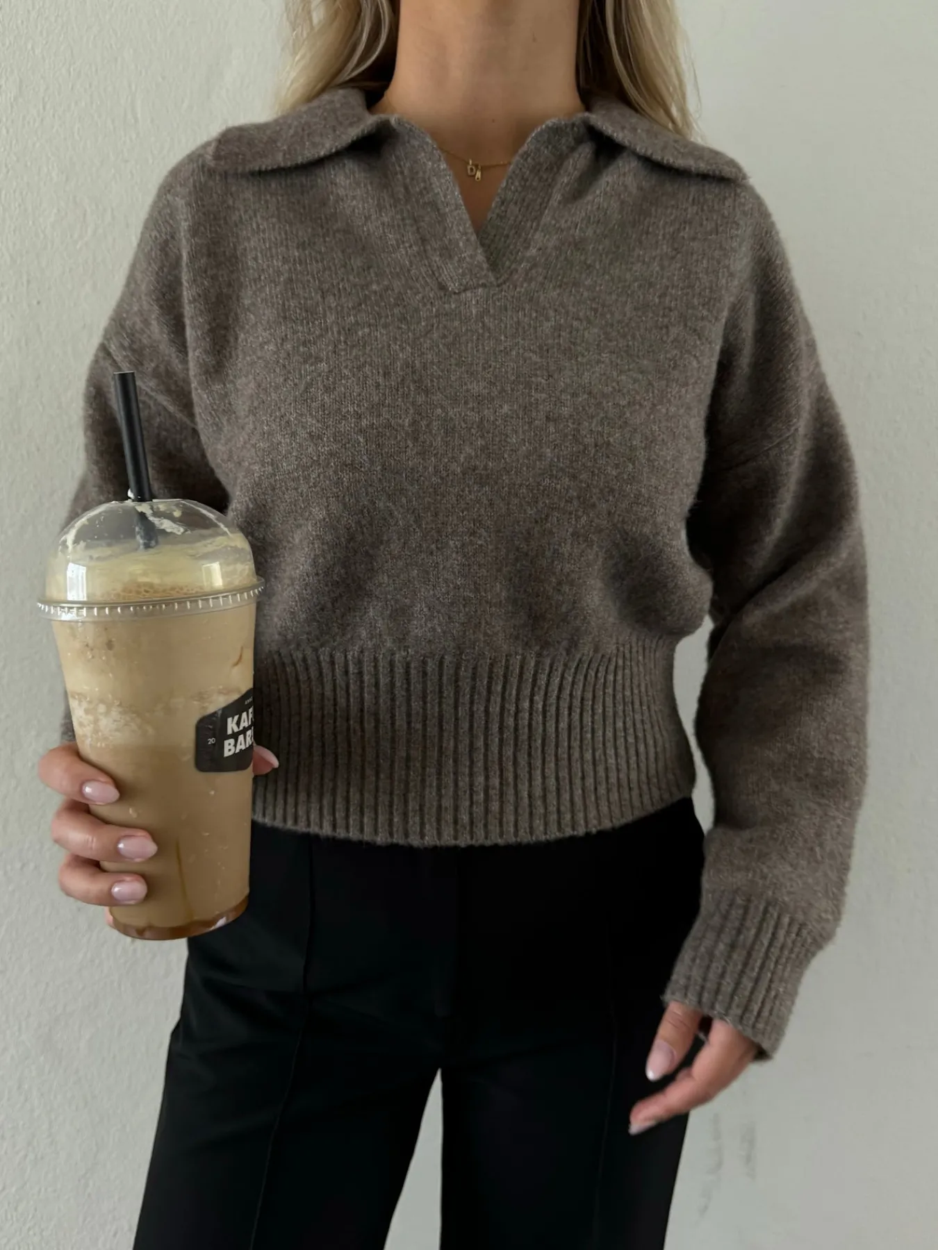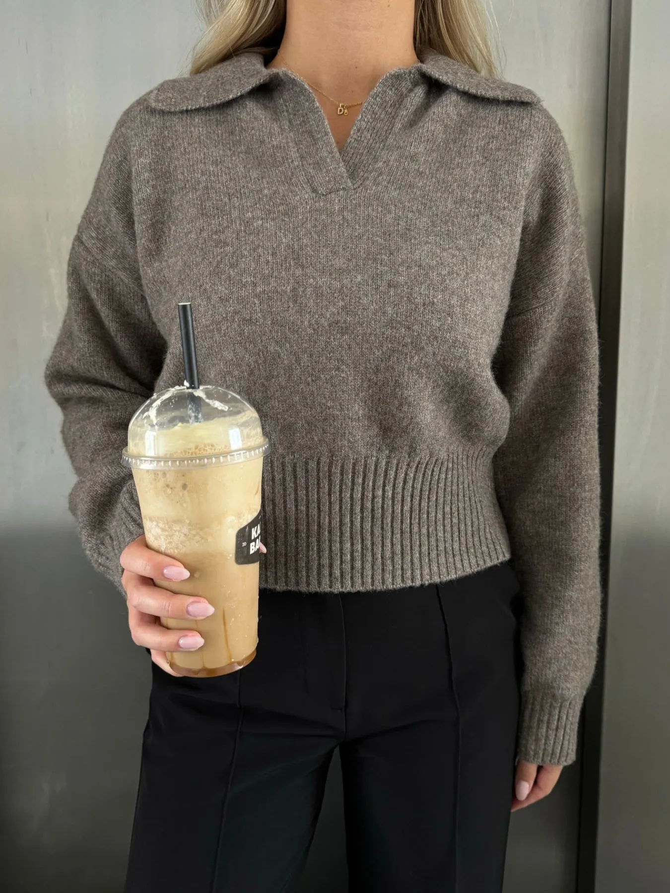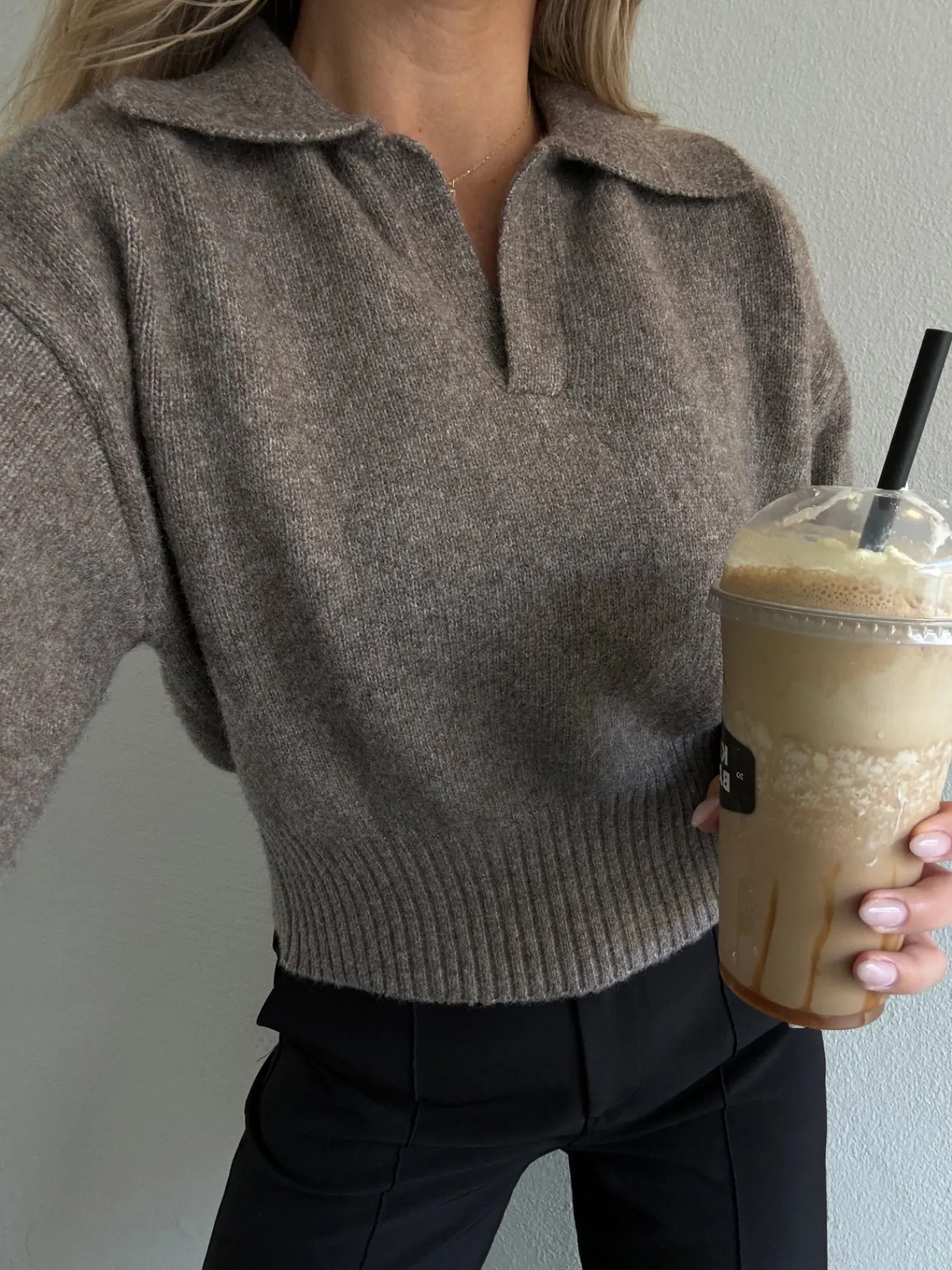 Elina strikken har den fineste krave og går ind omkring taljen og ned til hoften, så man får en flot figur. Den er blød og behagelig og ser vildt flot ud med et par Milly bukser.