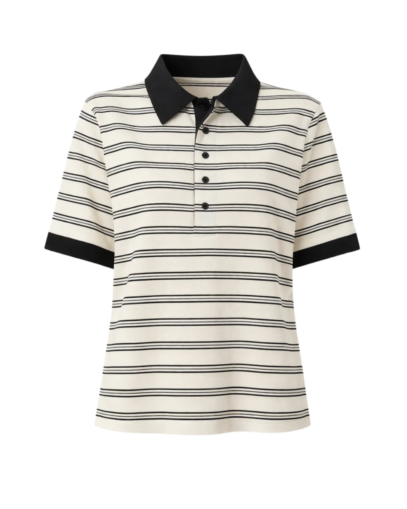 Denne stribede t-shirt skjorte har et klassisk og moderne udtryk med kontrastkrave og dekorativ knaplukning. Det let løstsiddende snit giver en behagelig pasform og god bevægelsesfrihed, mens det grafiske stribemønster tilfører et stilrent look. Skjorten er nem at style til både hverdag og arbejde og passer perfekt til både bukser og nederdel. Et tidløst valg med fokus på komfort og design.