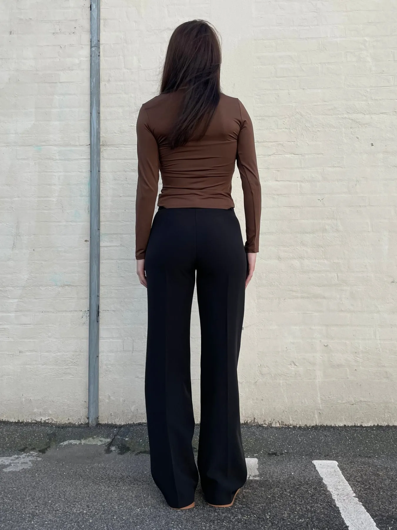Elegante og strækbare habitbukser. Bukserne har vidde i bunden og spændes med en knap i livet. Styles perfekt med et par sneakers eller stiletter.