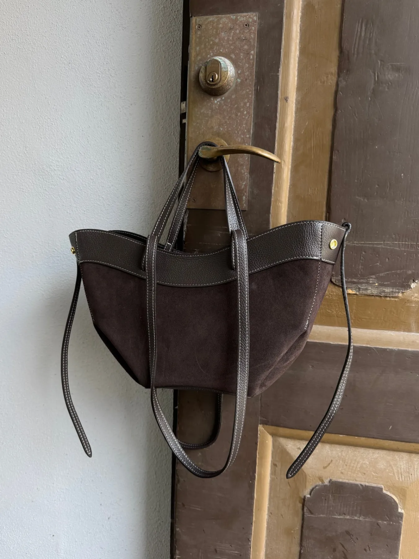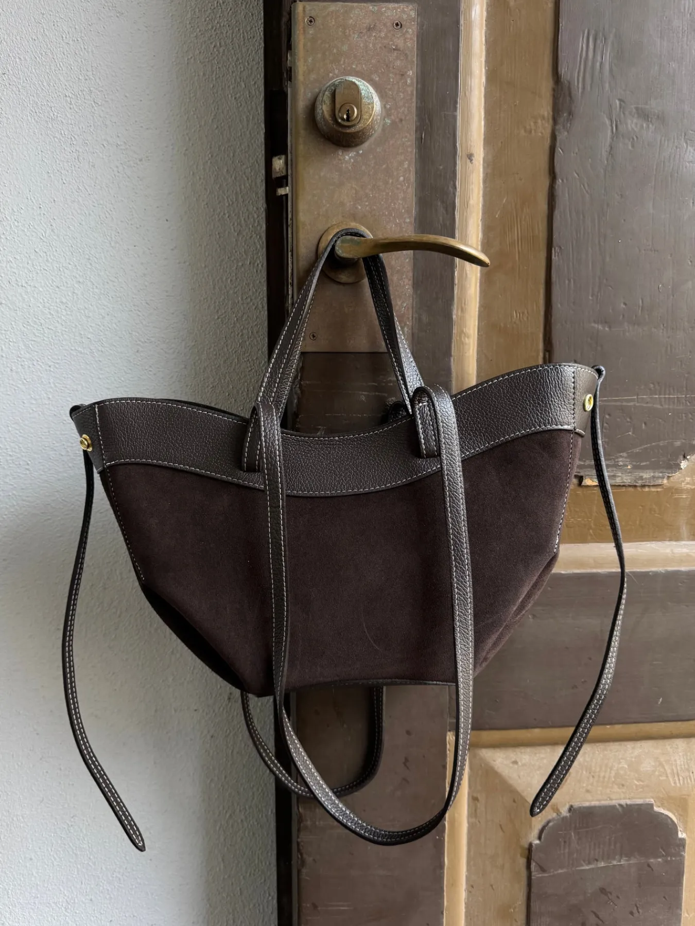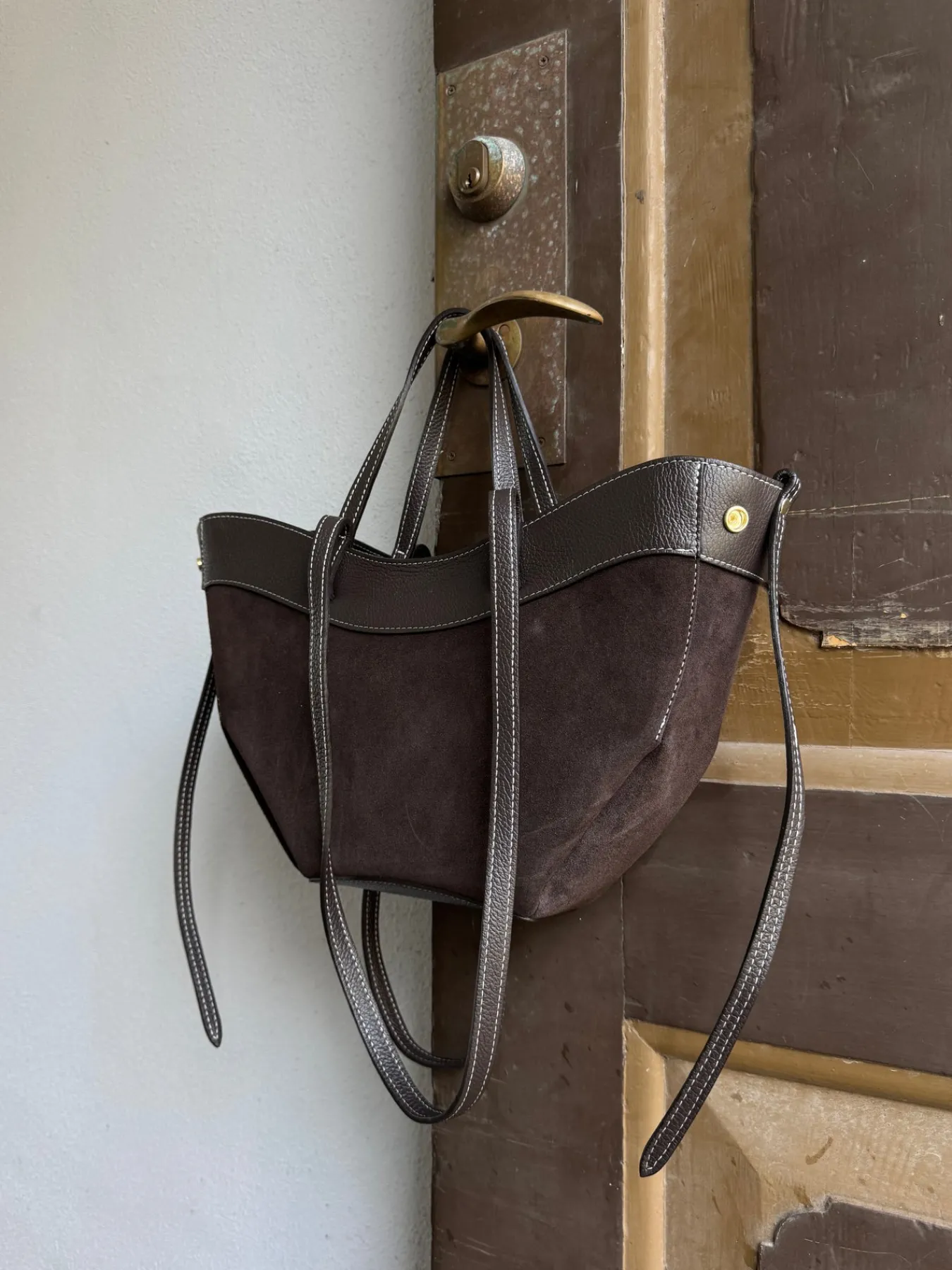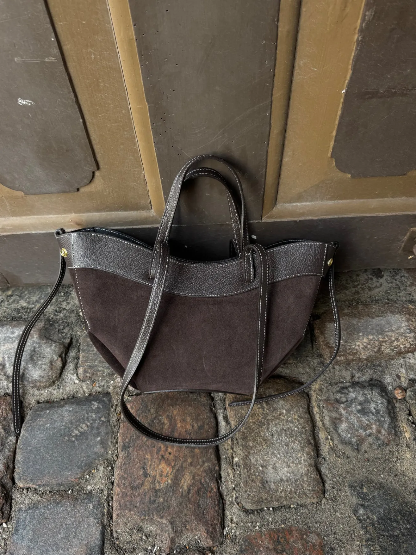 Matilda tasken er i ægte ruskind og har side knapper og en lynlås lukning. Den har indvendige lommer og har håndtag og skulderrem.