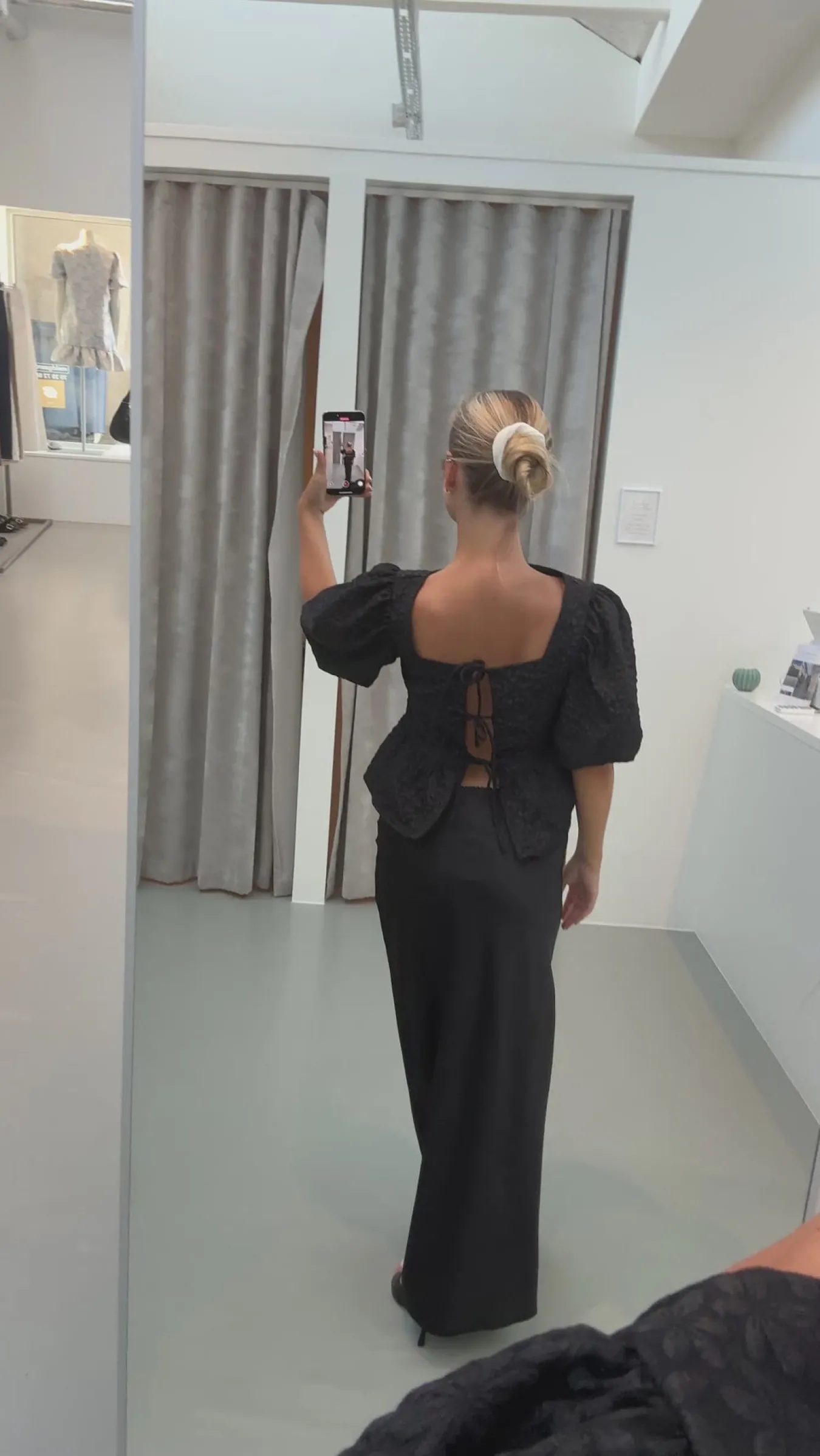 Elena blusen har de fineste puff-ærmer. Den bindes fortil og er den perfekte forårs bluse. Toppen kan vendes, så at du binder den på ryggen. Så giver den et klassisk og mindre åbent look.